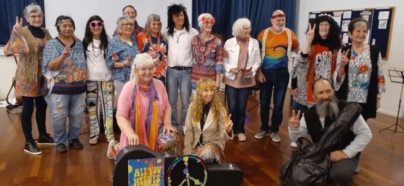 Last Tuesday we had another theme day for our group’s regular session. The theme was “Hippy Day”, where members were encouraged to dress up from memories of the Hippy era, and we played/sang songs from the Woodstock Music Festival and others from that era. It was a real blast man! Smoking joints was discouraged for health reasons, i.e. we no longer have the tolerance for such chemicals!